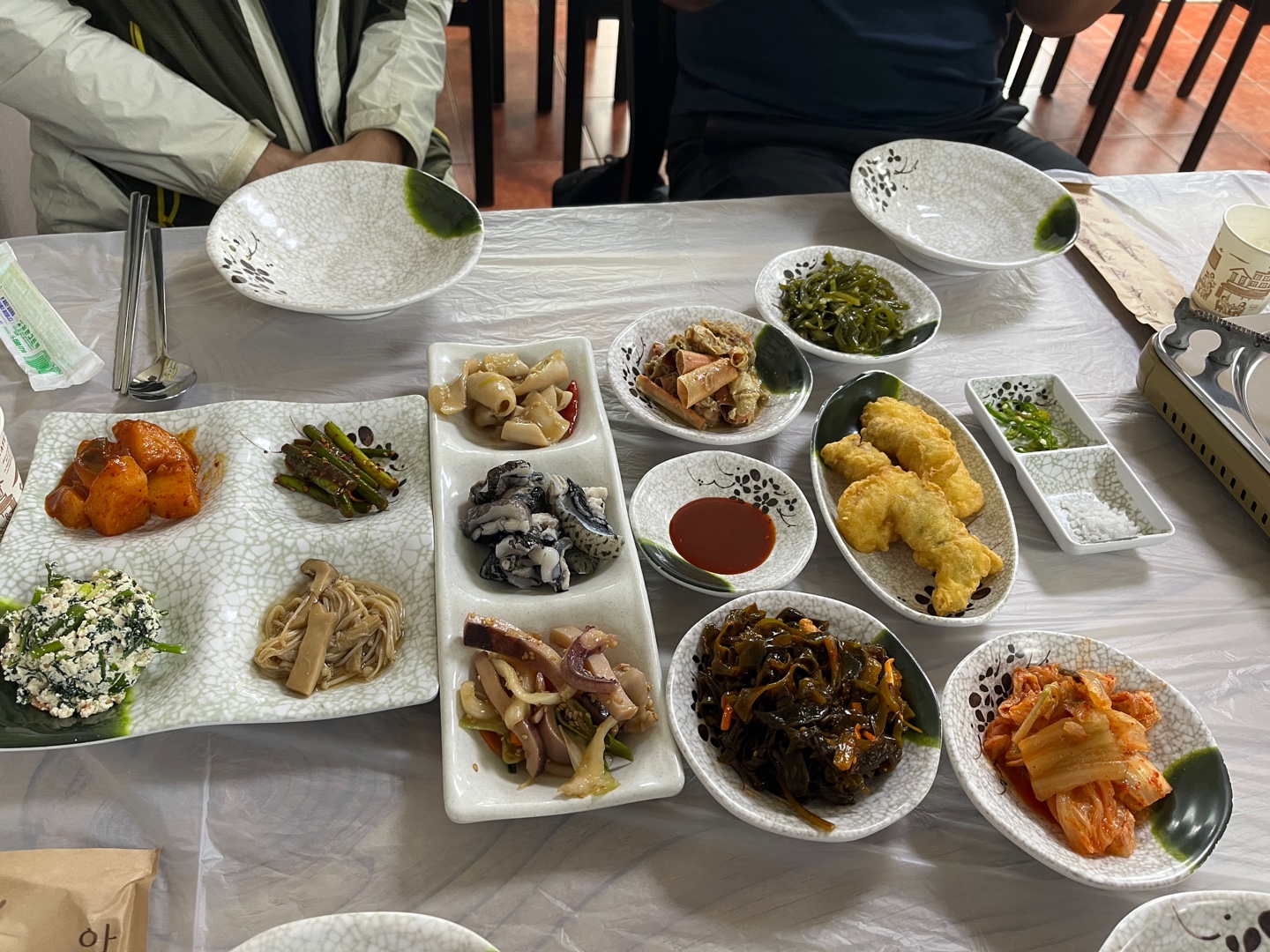 대구튀김, 미역무침, 홍게대게 무침, 오징어, 꼼치, 들었는데 이름을 기억 못하는 한치같은 조림,
